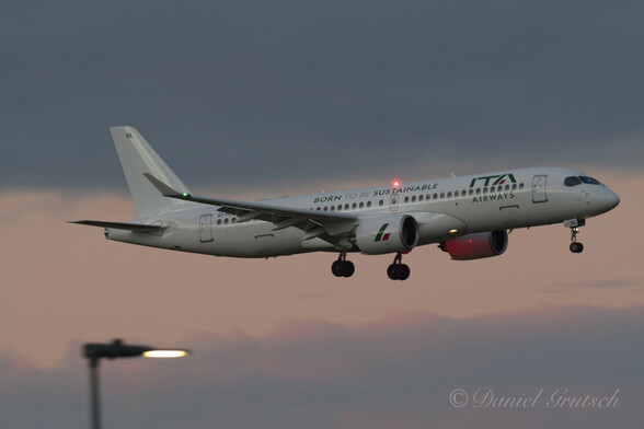 ITA Airways Airbus A220-300 wearing the "Born to be sustainable" livery arriving at Zurich Airport in the last light of the day. #planespotting #avgeek #speciallivery