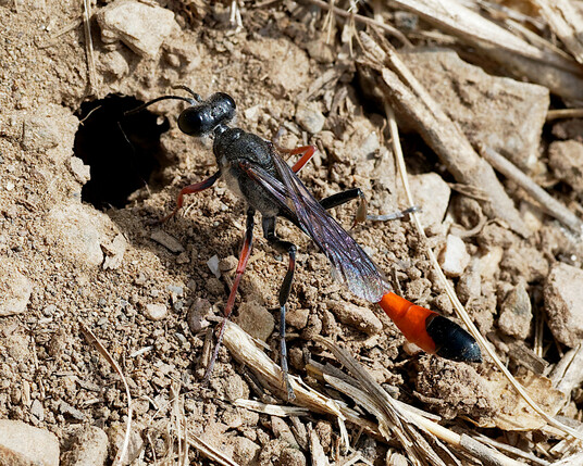 Una femella d'Ammophila heyden, de la família Sphecidae, davant del seu niu encara en construcció. Tot just després, entrarà diverses vegades per tal de fer la galeria més profunda.