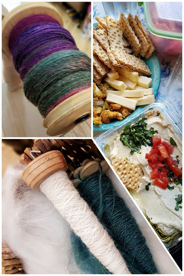#TourdeFleece: Woohoo! Had enough time yesterday morning to spin on my wheel (spinning the #faseradventskalender from 2017). later I could sit down, chat with a friend, eat something (syrian Hummous, yumm!) and spin more with my kurdish spindle while our toddlers were playing together.