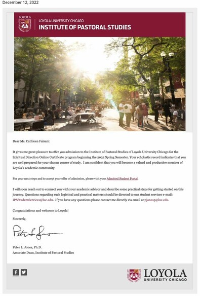 So, this just happened. Thank you @LoyolaChicago@twitter.com. Depending on financial aid options I will start this coming semester or in the fall. It's delightful to begin a new adventure. #spiritualdirection