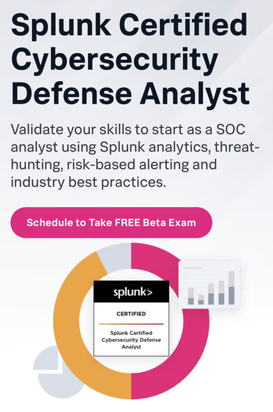 https://www.splunk.com/en_us/training/certification-track/splunk-certified-cybersecurity-defense-analyst.html Splunk Certified Cybersecurity Defense Analyst —> Free Beta Exam