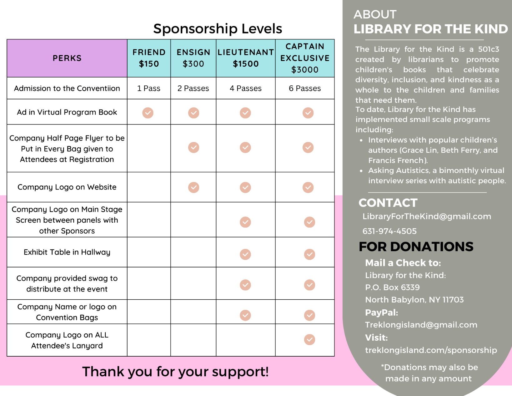 Good Evening! I kindly ask that you take a look at our sponsorship opportunities and the perks for you or your organizations. Proceeds of Trek Long Island go to organizations that support inclusive and diversity in books, Native American woman in STEAM and other foundations. Please Share!