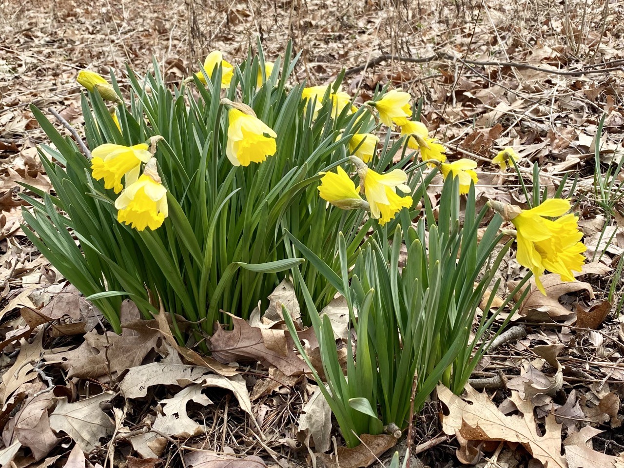 Photo of the #daffodils I planted last fall, taken this afternoon. Almost every bud opened today, but we're going to get heavy rain tonight (wouldn't you know it) so I grabbed another photo in case they get flattened. These are an heirloom variety called 'Dutch Master', so maybe they'll be able to tough it out. Fingers crossed. #SpringEphemerals