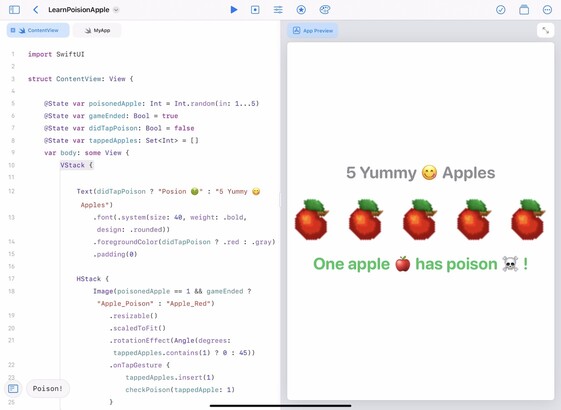 Put together a “Poisoned Apple” game for my students to make during class. I love how easy making simple games in #swiftui is. I am beginning to wonder if my students even need #spritekit at this point.