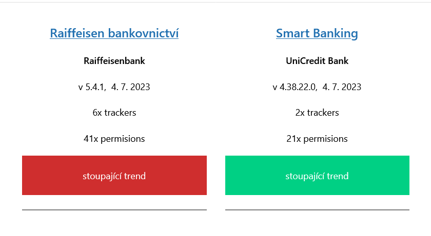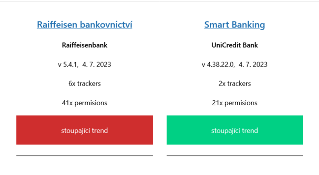 Nejlépe si opět vede Fio, nejhůře na tom je mBank (obrovské množství oprávnění) a Raifka (FB trackery, profilování).