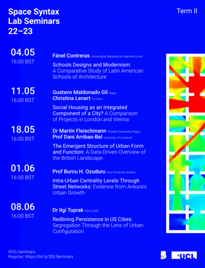 Excited to announce the new term of the #SpaceSyntax Lab Seminars. We look forward to talks by Fánel Contreras, Gustavo Maldonado Gil & Christina Lenart, @martinfleis & @darribas, Burcu H. Ozuduru, and Ilgit Toprak. #SSLSeminars @spacesyntax