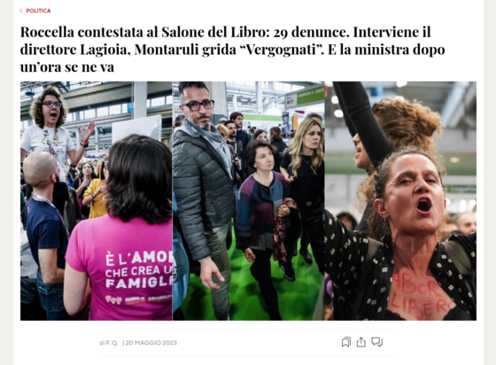 Davvero singolare vedere la #M0nt4ruli (condannata per #peculato con sentenza definitiva) gridi quasi come allo #Stadio (ma in realtà eravamo al salone del libro) verso #NicolaLagioia ovvero il direttore del salone del libro => #Vergognati