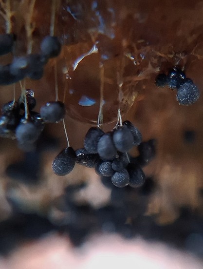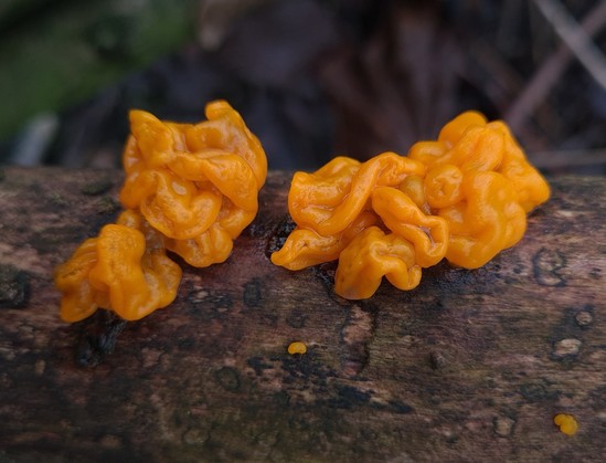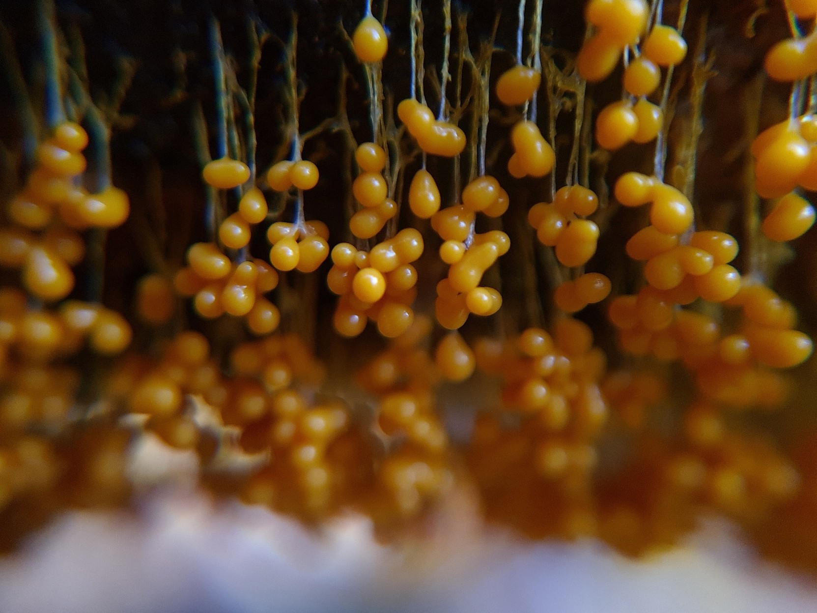 Dat gele slijm van laatst is een stadium verder, er hebben zich gele trosjes ontwikkeld, zo mooi en apart dat is.