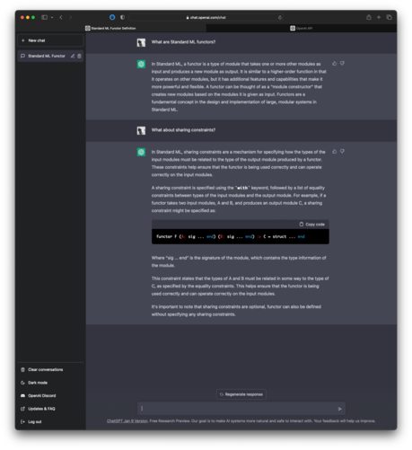 Right, so I had a tête-a-tête with #ChatGPT today about #programming in #StandardML modules, functors, and sharing constraints. The descriptions are accurate but imprecise. Still, I'm impressed. #AI may well replace us programmers, soon.