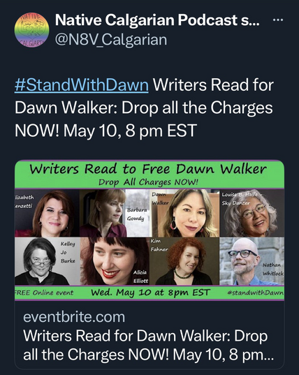 #StandWithDawn Writers Read for Dawn Walker: Drop all the Charges NOW! May 10, 8 pm EST https://www.eventbrite.com/e/writers-read-for-dawn-walker-drop-all-the-charges-now-may-10-8-pm-est-tickets-618257754587?fbclid=IwAR2CJNCsaW5hSbUJbOoqX3OztC_ed95ZmLjRWIkSvNeY-DygZ3E-3APT5DA