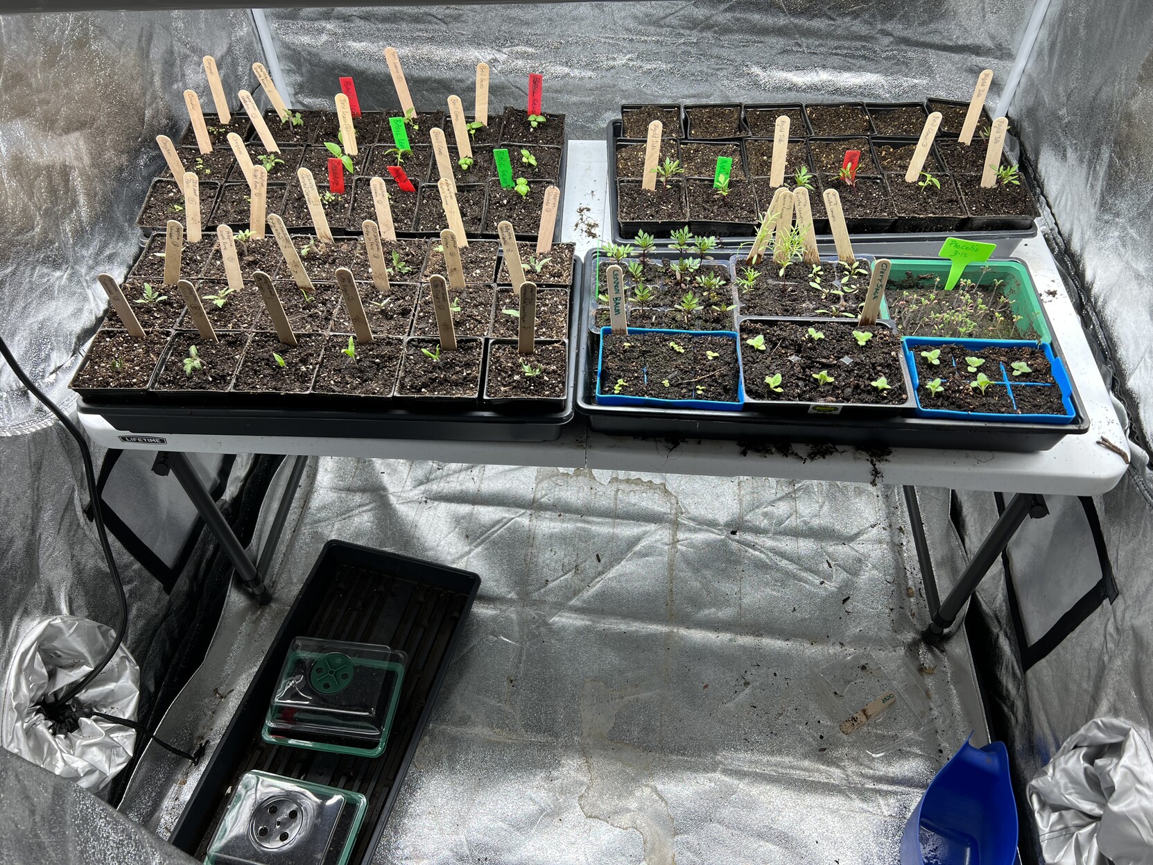 Now that I’ve learned to make hoop frames, I should be able to glue up two more beds’ worth tomorrow and get them installed and covered with poly tarp the day after. Then I can evict these babies to a warm outside hoophouse bed to grow a little bigger. #Gardening #StartingSeeds