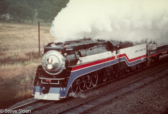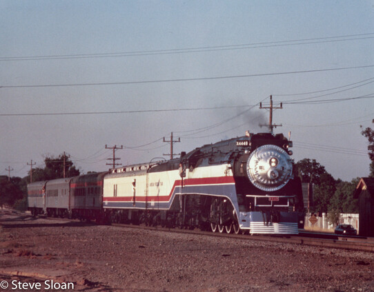 Reportedly, on June 22nd, 4449 was displayed with SP Bicentennial diesel SSW 9389 and steam locomotive CP Huntington. When the locomotive left Sacramento 6/23 it was pulling three SP passenger cars.