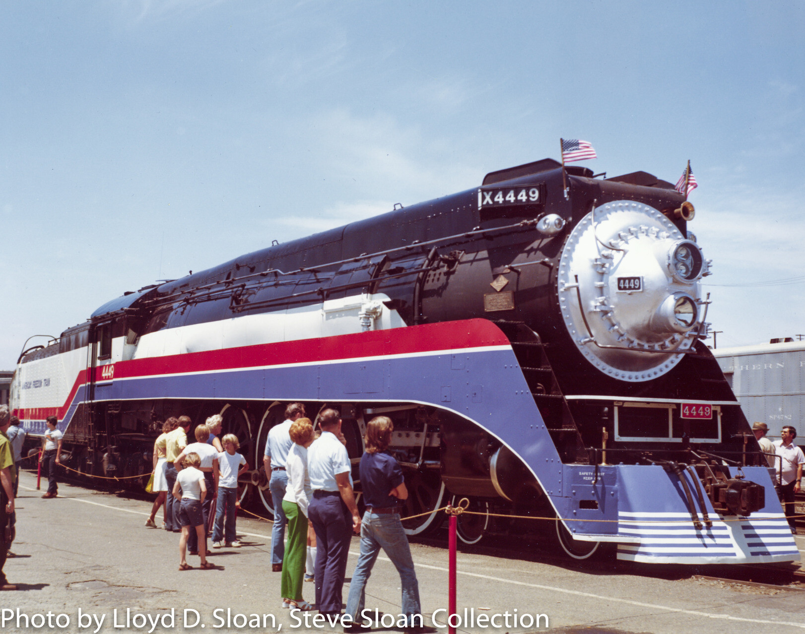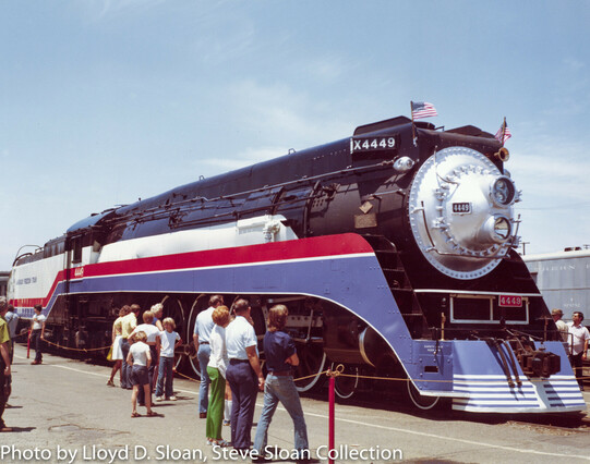 American Freedom Train (AFT) Southern Pacific (SP) 4449 and SP 1, the CP Huntington, were both on display in Sacramento on Sunday, June 22, 1975. 4449 was displayed with SP Bicentennial diesel SSW 9389 and steam locomotive CP Huntington.