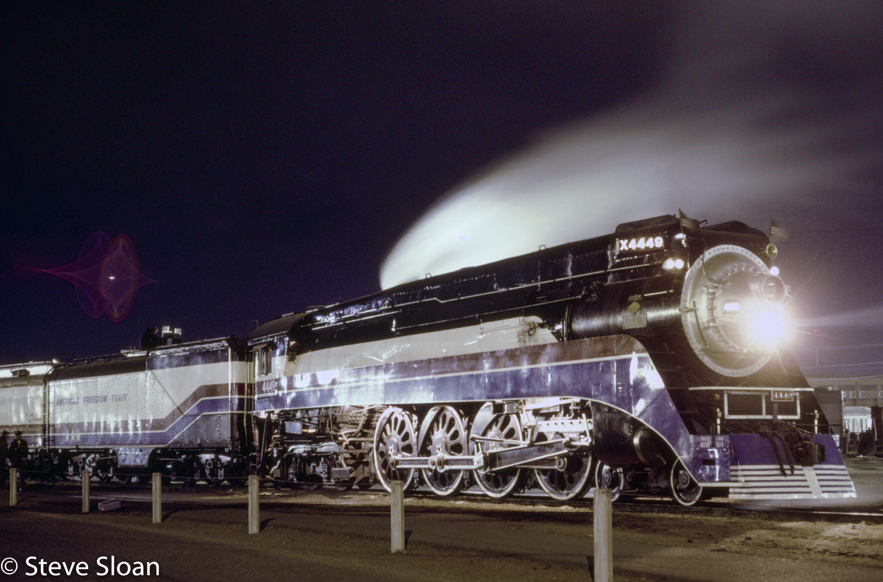 On November 24, 1975, Southern Pacific (SP) 4449 in Freedom Train colors is laying over for the night in Sparks, Nevada. The American Freedom Train was in Reno/Sparks, Nevada, November 24-26, 1975. This was the train's 45th display city. It was displayed next to the Nugget Casino, 14th and Nugget Ave. From there it went to Sacramento.