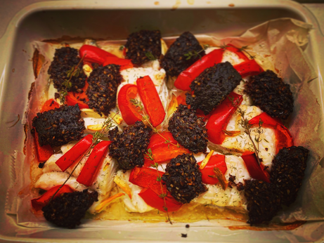 Baked cod from #georgesfishshop #stepaside with black pudding and red pepper
