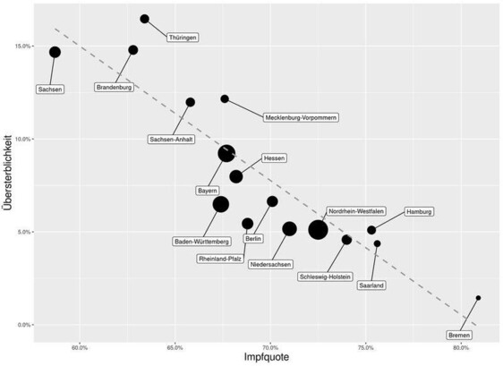 Da #SterbenDerGeimpften mal wieder trendet, hier ein paar Fakten zur #Uebersterblichkeit. Bremen hat mit der höchsten #Impfquote (80,9%) eine Übersterblichkeit von 1,44%, während sie in Sachsen mit niedrigster Impfquote (58,7%) bei 14,67% liegt. Quelle: https://www.vbio.de/aktuelles/details/starker-statistischer-zusammenhang-zwischen-der-covid-19-impfquote-und-der-uebersterblichkeit