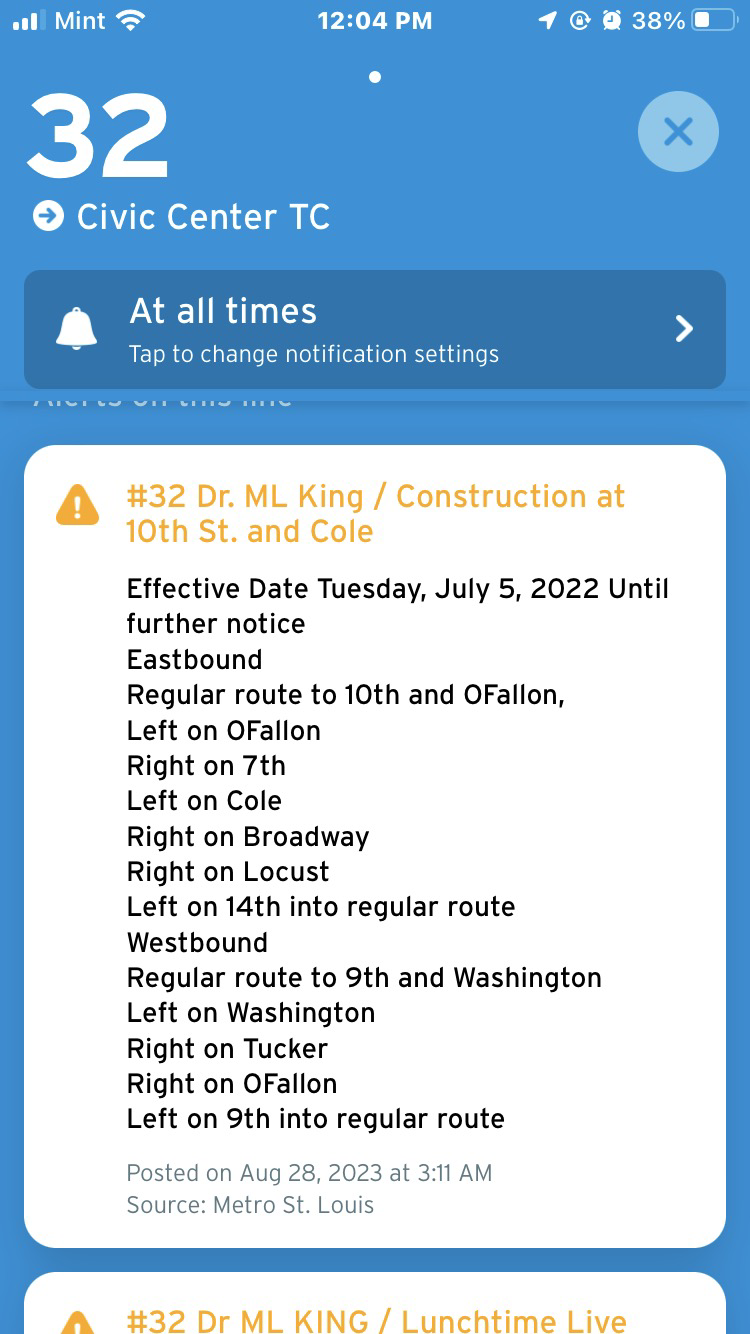 Since July ‘22 the #32 Metro bus had a reroute due to 10th St being closed for convention ctr const: left on O’Fallon rather than straight. But now it turns right on O’Fallon to left on Tucker. Another reroute involving lunchtime live on Locust only applies if bus goes left on O’Fallon. #stl