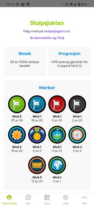 Her er jeg, jeg nærmer meg nivå 10, og på merkene er jeg på nivå 2 på Grønne stolper, Besøk kart, Norgesvenn, og Erobrer. Ellers kun på nivå 1 på resten.