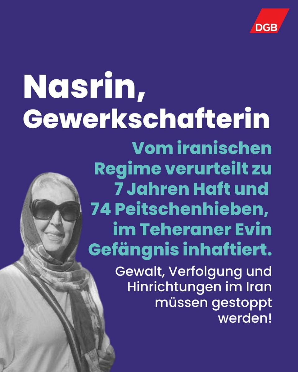 Seit Monaten kämpfen die Menschen im #Iran für ihre Rechte, darunter auch viele Gewerkschafter*innen. Wie Nasrin werden sie verfolgt oder inhaftiert.