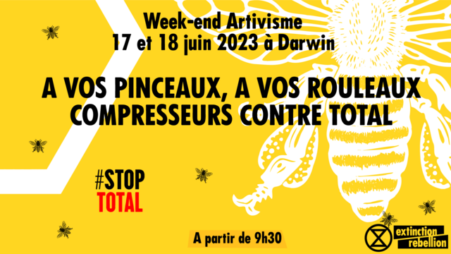 Petit rappel pour ce week end artivisme 🎨 . Rendez-vous à Darwin, à partir de 9h30, des gateaux🥐 et du café☕ vous attendrons. Préparation de banderoles contre Total et son monde. ⛽