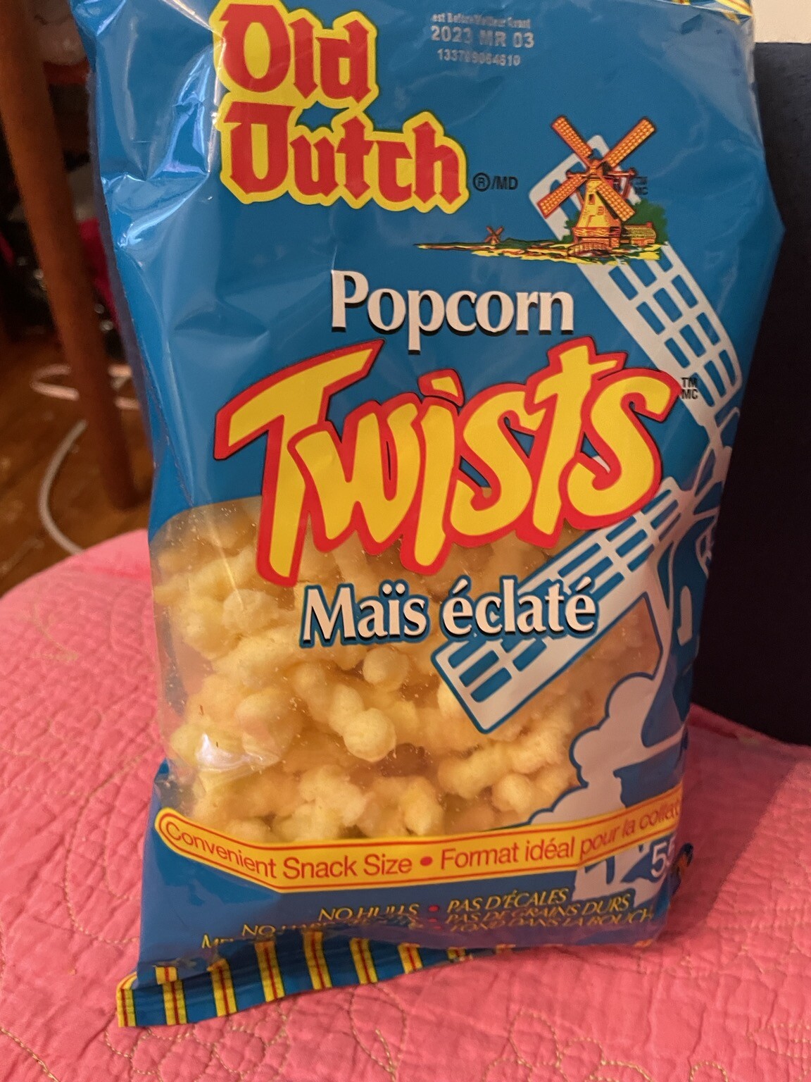 Is it time for the #stormchips ? ID: Photo of Old Dutch Popcorn Twists, that are in a blue cellophane bag. #OnStorm #Weather #WeirdChips #Sodium