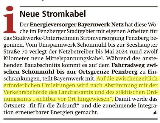 Zwischen #Penzberg und Bichl werden momentan unter dem #Radweg neue Kabel verlegt - im Lokalblatt wurde eine Umleitung versprochen. https://epaper.mrs-muenchen.de/webreader-v3/index.html#/817578/3