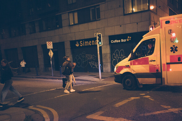 "A woman crossed a road when an ambulance broke a red light with sirens on. She waved nervously, but the driver slowed down and stopped just in time. She continued on her way feeling grateful that the driver had been attentive despite rushing to an emergency. A safe and uneventful crossing."