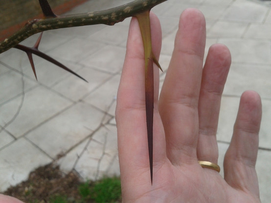 Thorn of a Honey Locust (I think), planted as a #StreetTree -- this is a N American species in the pea or legume family #Fabaceae. A similar introduced 'thorn tree' is encountered in southern Africa and has a bad rep as invasive, thought it could also be seen as worldmaking. The pea family is formidable and important, immense powers of foraging, and third largest flowering plant family. The thorns must have evolved to deter species long extinct.