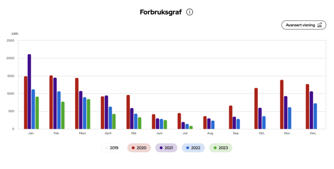 Er ganske blid på grafene selv. Ikke for det: varmtvann har vi på felles og vi har brukt stadig mer og mer ved til oppvarming, men pene grafer da! Sist gang det ikke var reduksjon mot samme måned foregående år var april ‘21.