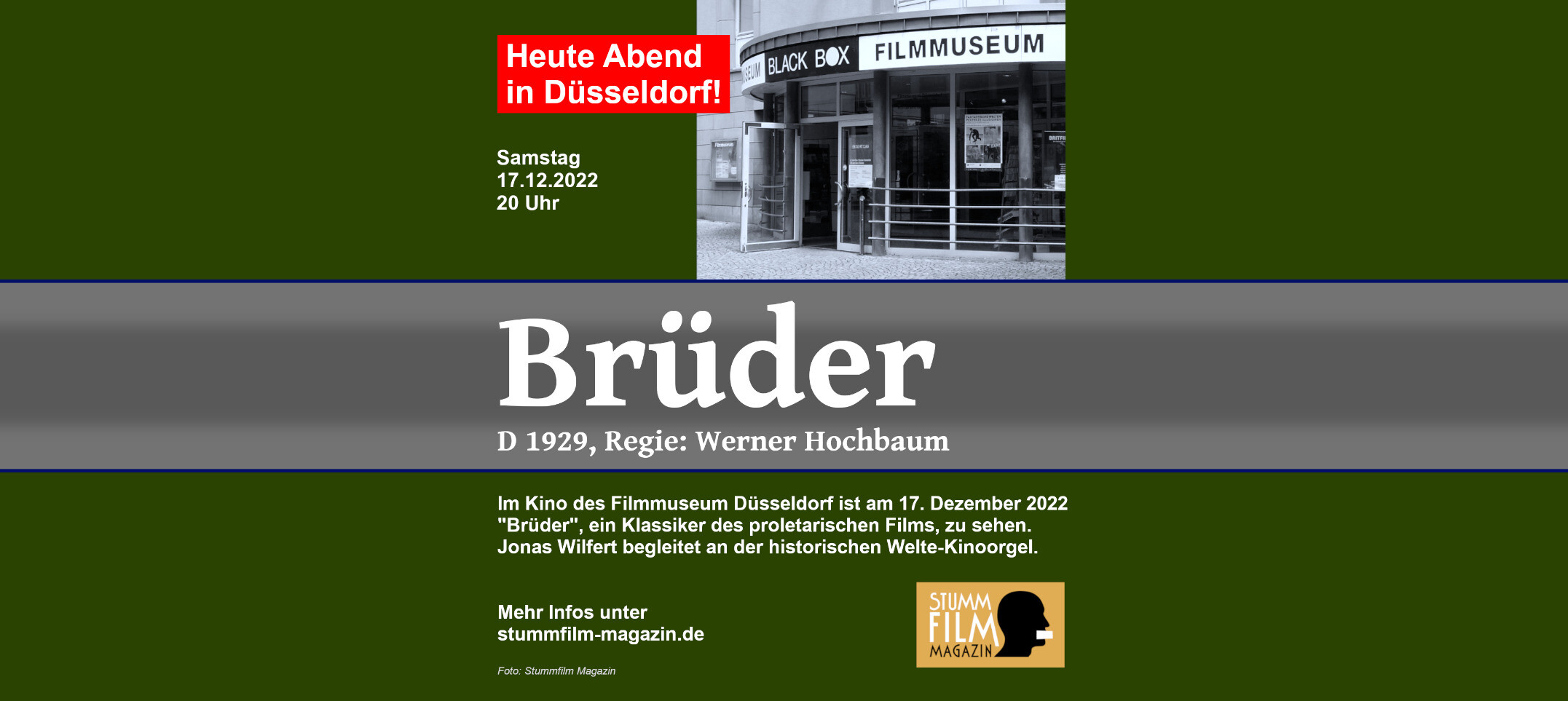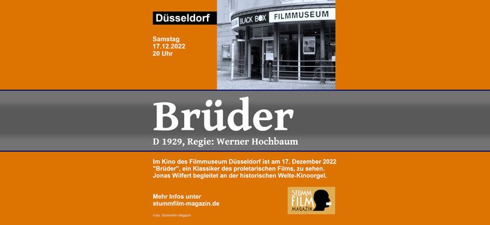 🎬 Kommenden Samstag! In der Black Box, dem Kino des Filmmuseum Düsseldorf, ist in der monatlichen Reihe "Stummfilm + Musik" am 17. Dezember 2022 um 20:00 Uhr "Brüder" (D 1929) mit Livemusik von Jonas Wilfert zu erleben. Mehr Infos unter http://www.stummfilm-magazin.de