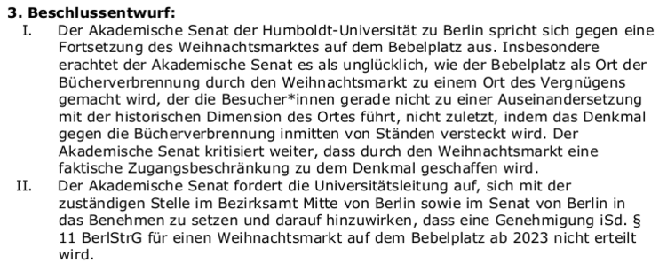 Wichtiger Antrag zur Kritik des StuPa an der Durchführung des Weihnachtsmarkts auf dem Platz der Bücherverbrennung. Einstimmig Angenommen!