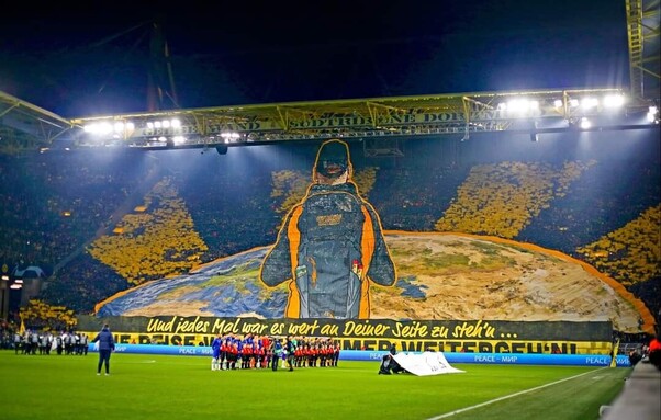 ก่อนเกม UEFA Champions League เมื่อคืน ที่อัฒจันทร์ฝั่งทิศใต้มีการแปลอักษรเป็นรูปแฟนบอลโบรุสเซีย ดอร์ทมุนด์สวมหมวกและสะพายเป้ที่มีคำว่า "Südtribüne Dortmund" เตรียมออกเดินทางไปทั่วยุโรป ด้านล่างมีข้อความที่แปลได้ว่า