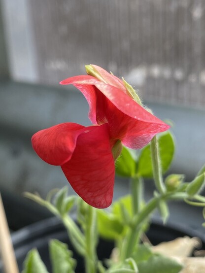 This is the only sweet pea that bloomed in my greenhouse so far. I have a tall and showy sweet pea bush with lots of buds, but they keep dropping. This pink one is a very scraggly skinny plant that turned out to be the winner. Story of our lives.