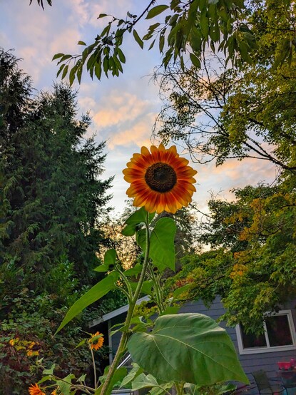 So our uninvited (though welcome) freeloader sunflower has certainly made itself at home. “Hey, I hope you don’t mind if I invite a few of my friends.” And not only that, they’ve all brought their bee-friends, who buzz around all day doing who-knows-what! It’s a nonstop party in the backyard now! Kind of nice, of course.