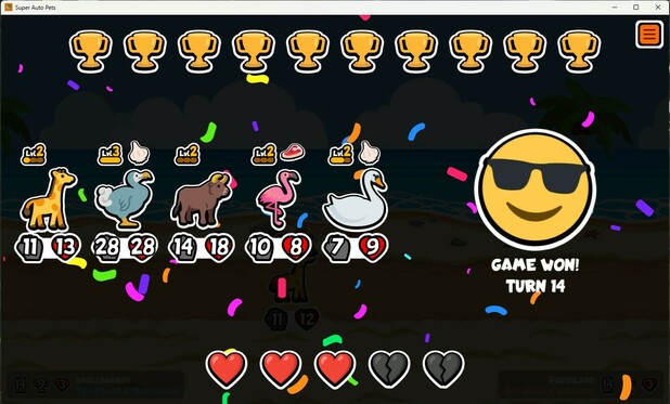 Finally won a game of #SuperAutoPets . True, after 13 hours of gameplay, it was bound to happen. But, woah, what a lucky combo. https://t.co/3tGP666VRG