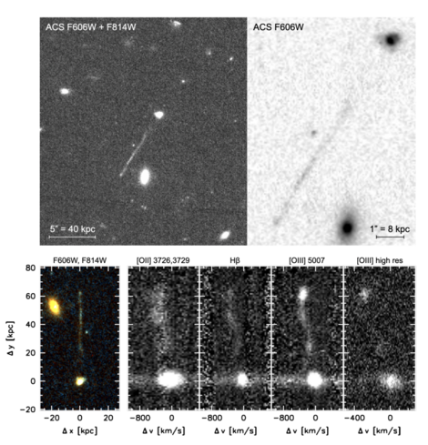 This one then ploughed through circumgalactic gas, creating a 200,000 light-year-long tail of new stars & shock fronts. Hubble first took the data, but then lots of spectra were taken by Keck. The redshift is 0.964!