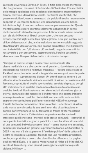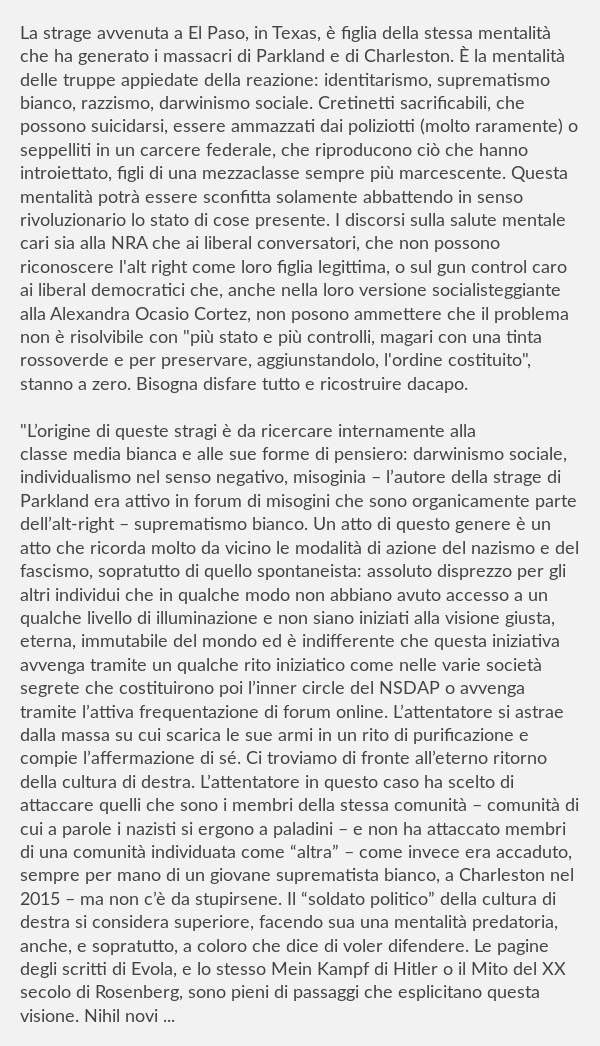 Due righe, riprendendo un articolo dell'anno scorso, sugli attacchi dei #suprematistibianchi negli #USA, come l'ultime di #ElPaso. Di seguito il link all'articolo originale, scritto in occasione dell'attacco di #Parkland: https://photostream.noblogs.org/2018/03/armi-societa-e-potere-militarizzazione-sociale/