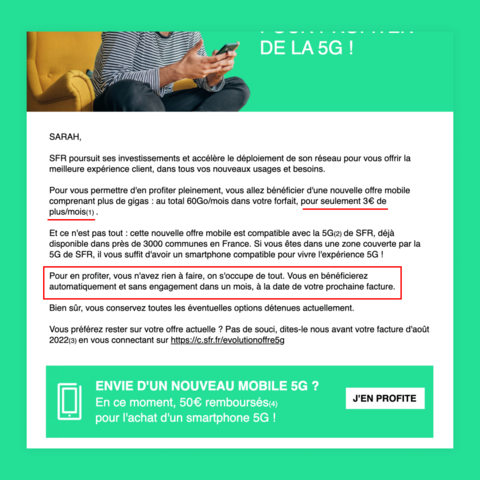 Le titre du mail : “SARAH, votre forfait évolue avec plus de gigas… Pour en profiter encore plus !”