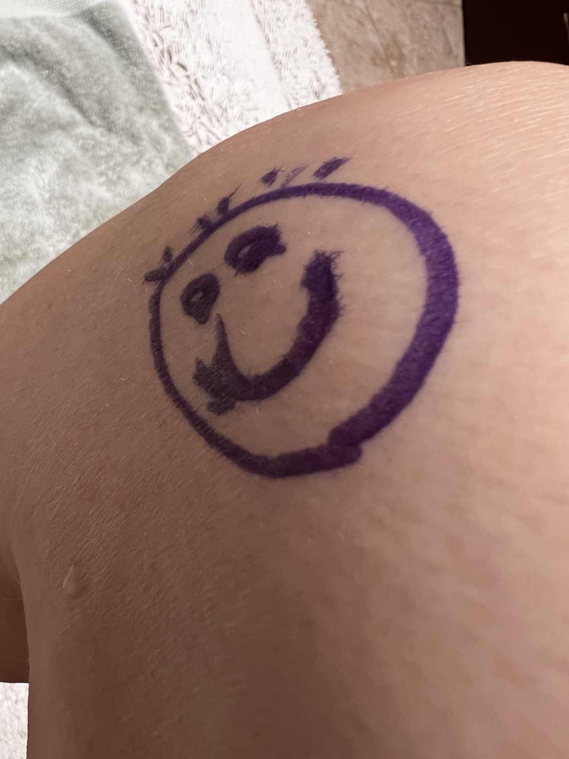 My hip replacement surgeon drew a face on the inside of my knee to remind me not to internally rotate my leg (risk of dislocation) 😂