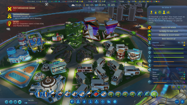 So, das "Surviving" in Surviving Mars ist nun endgültig vorbei. Ich habe über 1000 Bewohner und eine Kuppel die komplett nur auf Tourismus ausgelegt ist. Inklusive Bar, Diner, Tennisplätzen, einer atembaren Atmosphäre ausserhalb der Kuppeln, einer Sightseeing-Fahrt, Wälder, Seen und Krankenhäusern mit Verjüngungskuren.