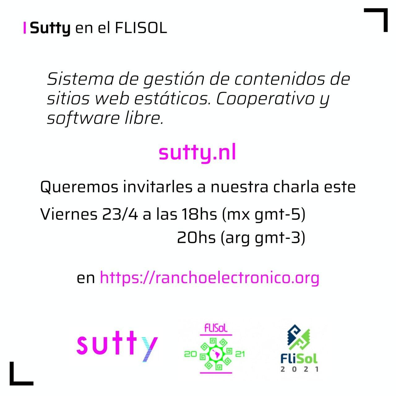 @sutty en el Festival Latinoamericano de Instalación de Software Libre (#FLISoL) -- Queremos invitarles a nuestra charla esta viernes 23/4 a las 18 hs México (GMT -5), 20 hs Argentina (GMT -3) en https://ranchoelectronico.org/ @ranchoelectronico@social.mayfirst.org -- #Sutty es una gestora de contenidos para sitios web estáticos de software libre y cooperativa.