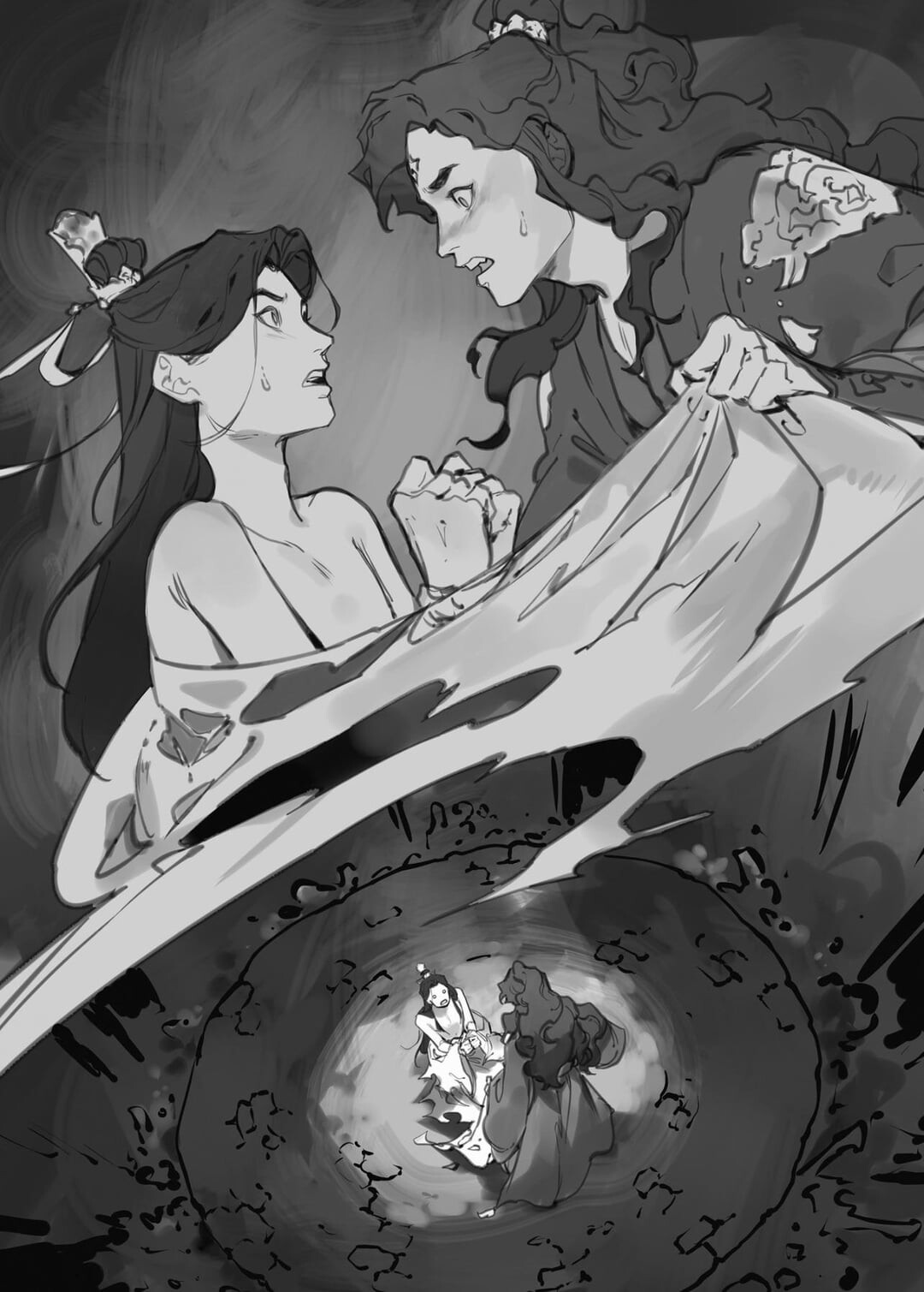 "Shen Qingqiu's outer robe had already been ripped to shreds by the Little Palace Mistress's whip. With this tug, over half of it tore straight off his shoulder.