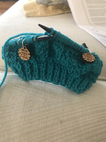 Taking the weekend off from #Work and #union work to combat #burnout. Finally getting somewhere on this sweater Iโm #Knitting. Especially enjoying these sweater increase stitch markers from ANeedleRunsThroughIt on #etsy. #SweaterKnitting