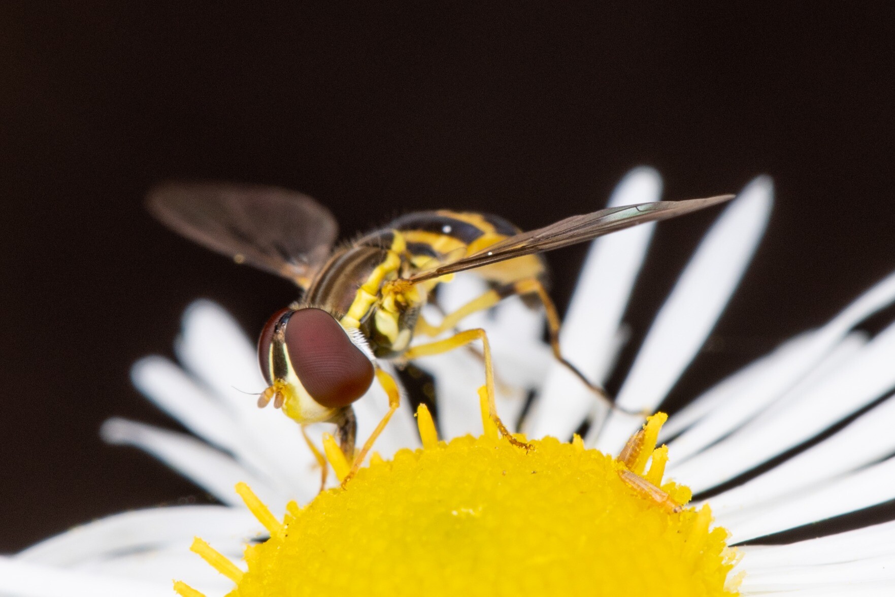 It’s that time of the year when the sunset betrays you, rain and cold sneak in, and there’s barely a flower on sight. Yet daisies and chrysanthemums brighten our sights, and the only insects around are a bunch of flies like this one: