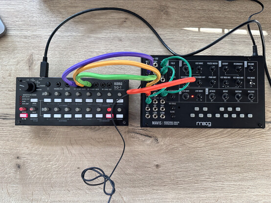 I bought an 'I'm feeling ill so I'll buy myself a present' present earlier this week and it is SO MUCH FUN. I need an audio interface so I can record this, but patching the Korg SQ-1 into the Moog Mavis is resulting in some lovely repetitive patterns.