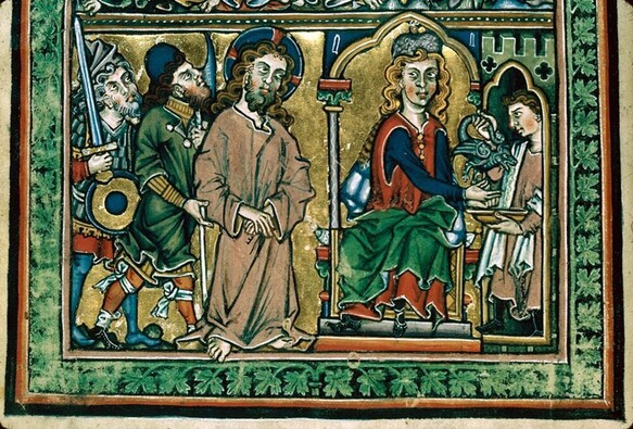Pilatus wast zijn handen in onschuld vandaag. Het water komt uit een aquamanile in de vorm van een griffioen. Psalter Bonmont 1260. Foto 2: aquamanile in de vorm van een griffioen coll. LensLouvre - ca 1400