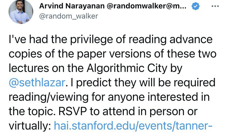 @random_walker @sethlazar ➡️'#AlgorithmicCity' Jan 24/25 #TannerLecture by @sethlazar looks fascinating. May it reach so high & far as #AmartyaSen's in 1979, also at Stanford, which reshaped social thought w/#CapabilitiesApproach https://drive.google.com/file/d/1vSA-S_QJb0hziEGr3ka5e46jD1aILDDv/view?usp=drivesdk. SCHI: pls record, YT livestream, notify when avail? https://twitter.com/random_walker/status/1610387491173072896