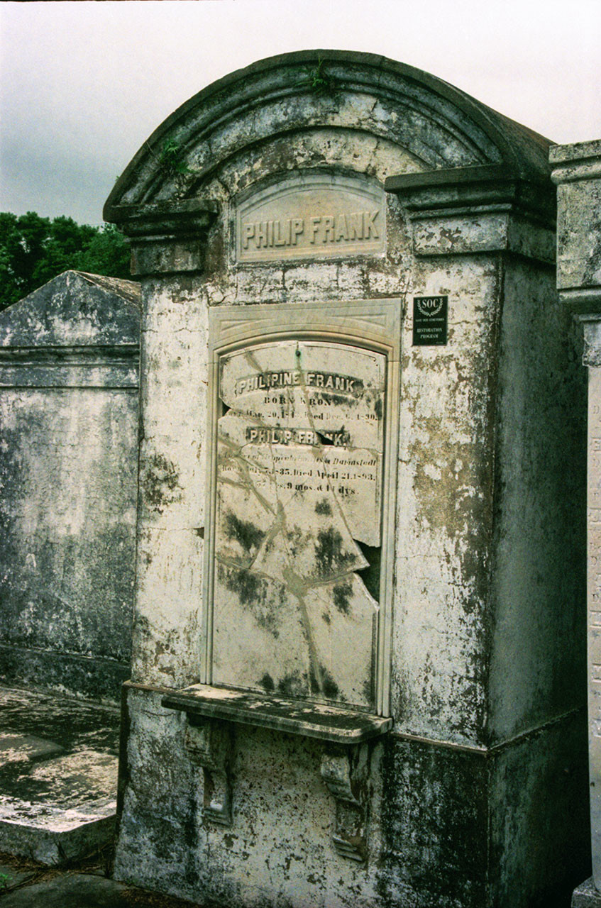 I am not aware of anything notable about Philip Frank or his wife Philipine, whose tomb stands in Lafayette Cemetery #1 in New Orleans. The marble entrance has been pieced back together after heavy damage by the elements or vandals. That’s the work of Save Our Cemeteries, a non-profit that repairs tombs and, provides cemetery tours in NOLA. Their plaque indicates a restoration in progress.