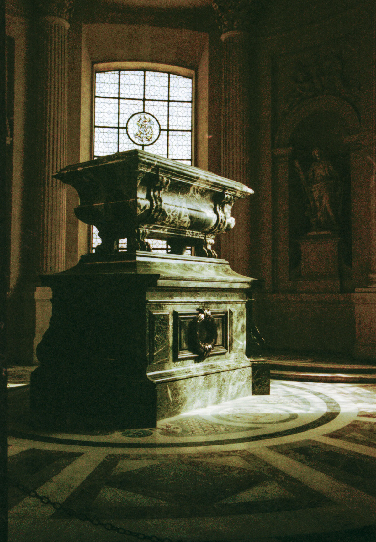 Once he was the King of Spain. Now, he lies in this marble sarcophagus under the dome of Les Invalides in Paris. This is the tomb of Joseph-Napoleon Bonaparte, younger brother of the well-known Napoleon. After defeat in the Battle of Paris in 1814, Joseph fled to the U.S. where he lived comfortably on the proceeds from jewels retained from his stint as the King of Spain. He moved to London in 1832 until his death in 1844.