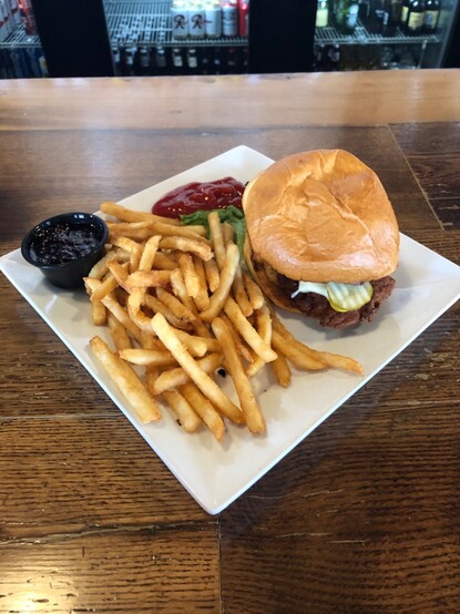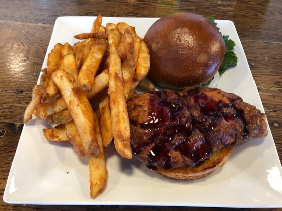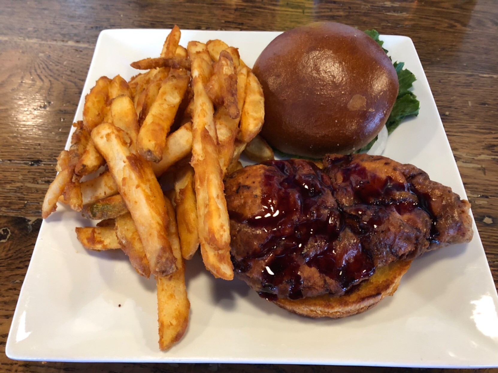There are limited dining options in West Yellowstone, Montana during the off-season, but you can still find delicious like the pork cutlet sandwich at Hanks Chop Shop.